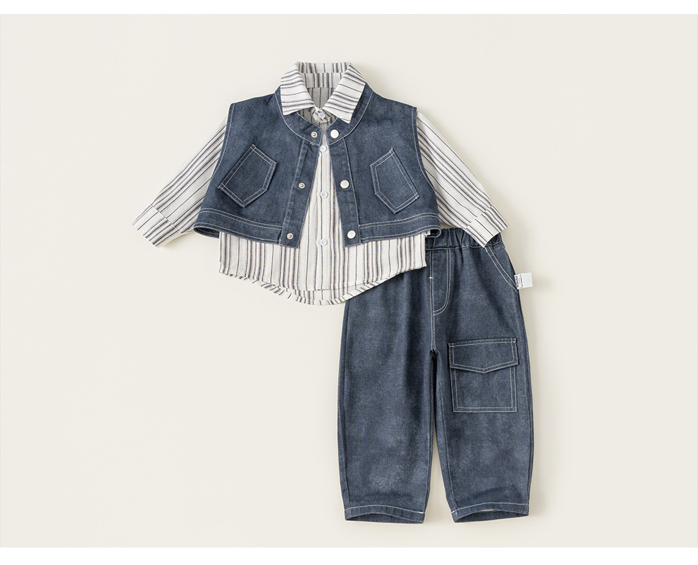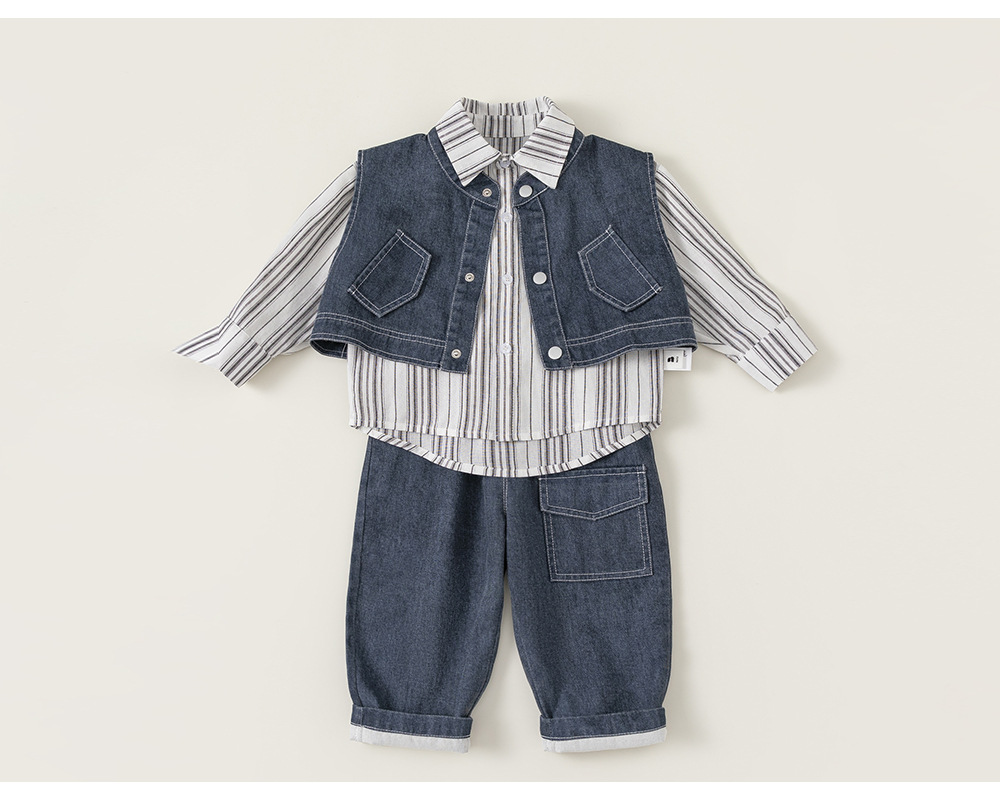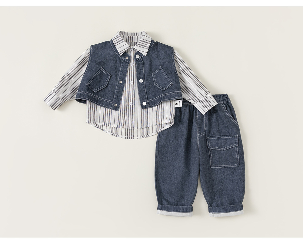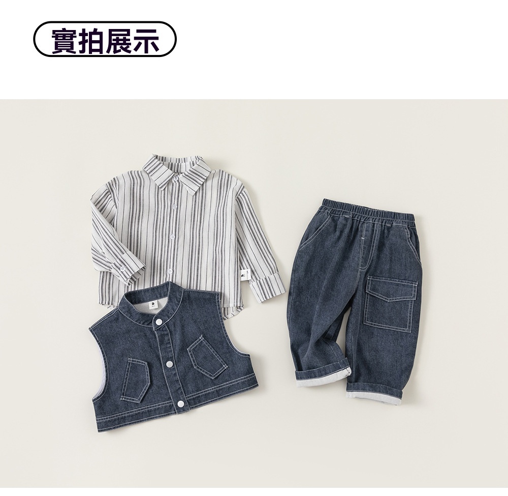 兒童套裝韓版童裝炸街痞帥秋款條紋長袖襯衫馬甲男童三件套