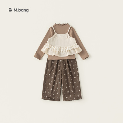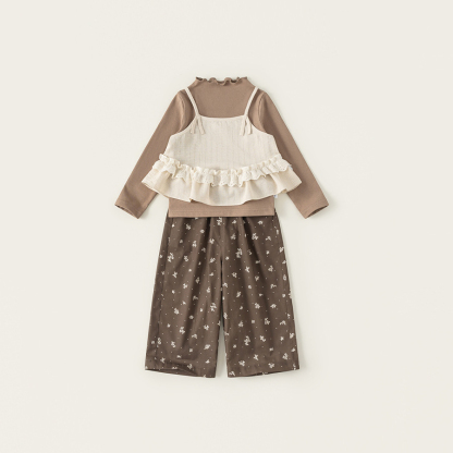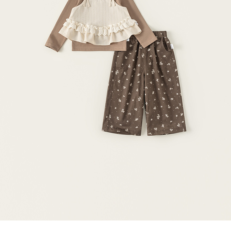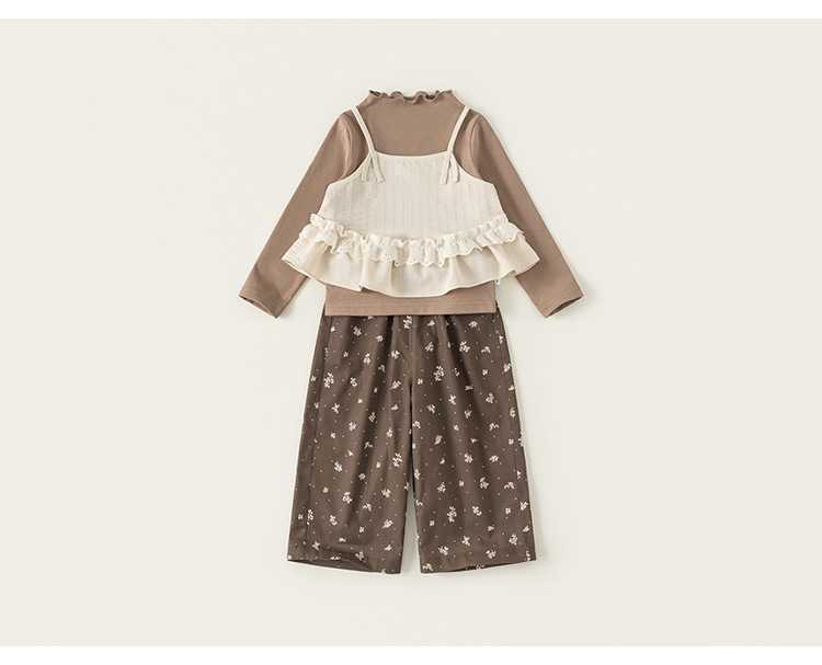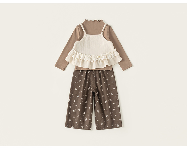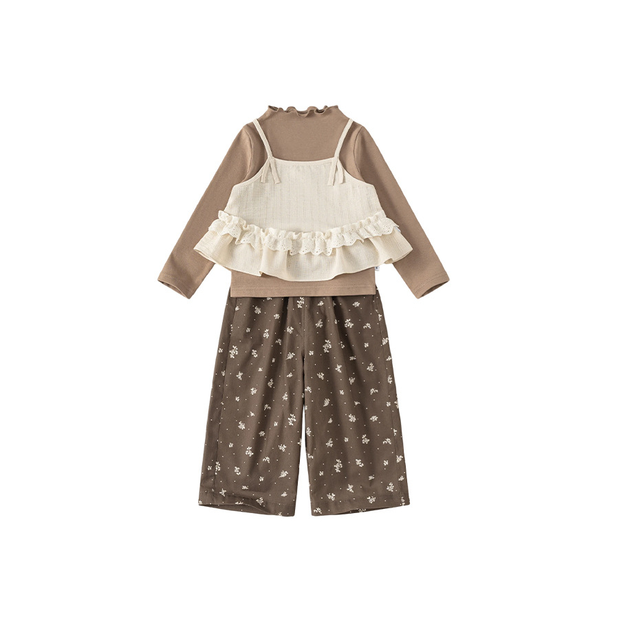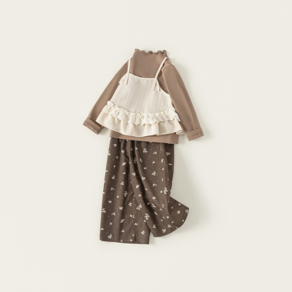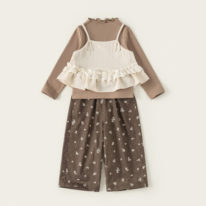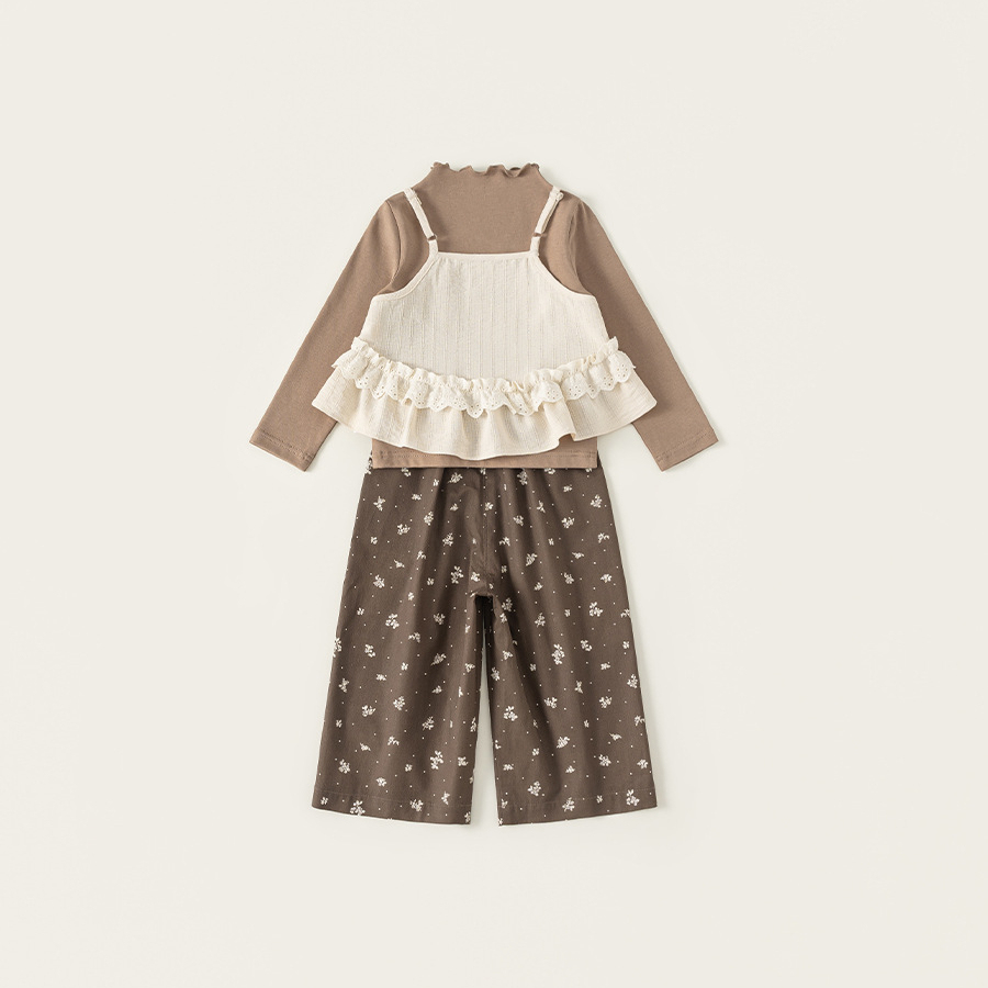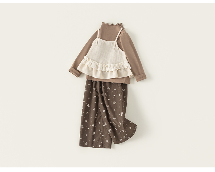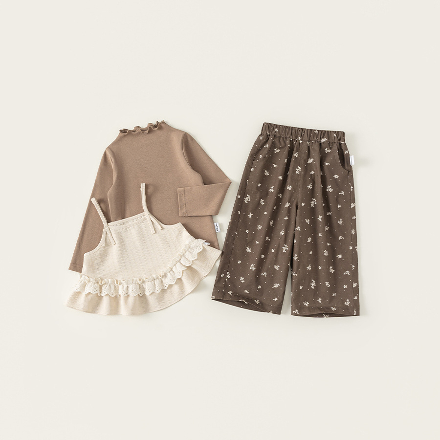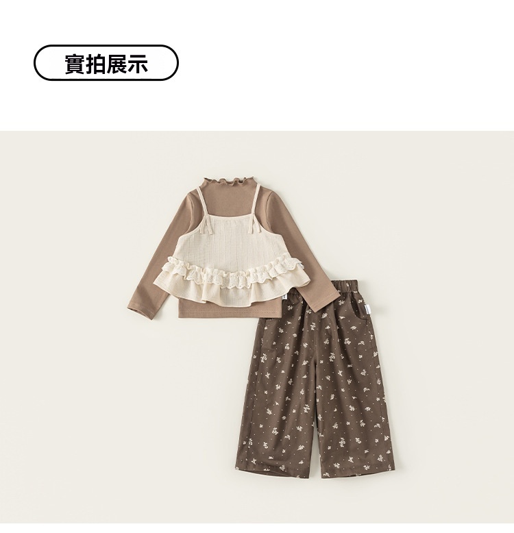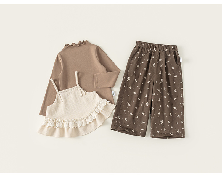 童裝兒童套裝花邊純色吊帶木耳邊打底衫碎花休閒褲女童三件套