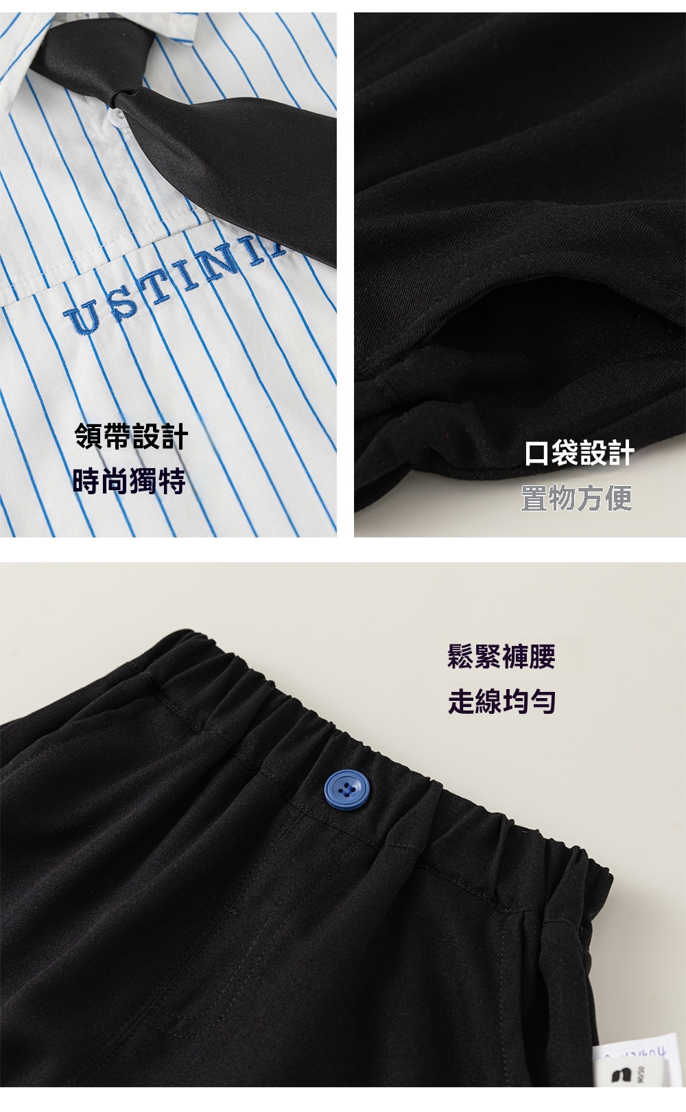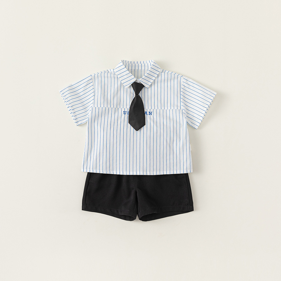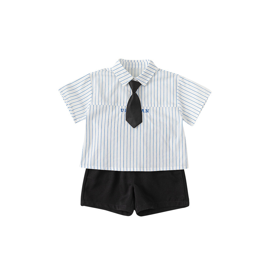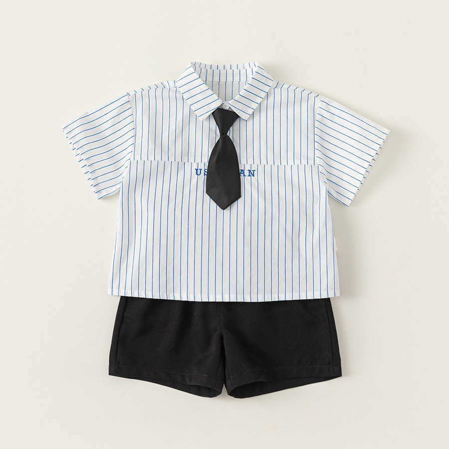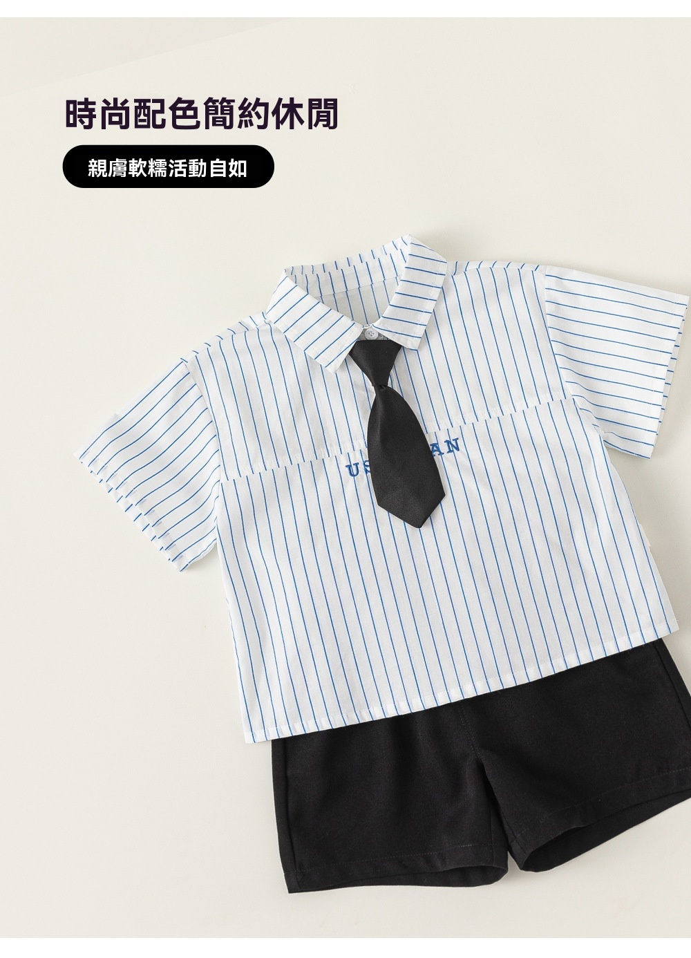 童裝夏季童裝男童學院風兩件套班服兒童領帶條紋襯衫小童套裝