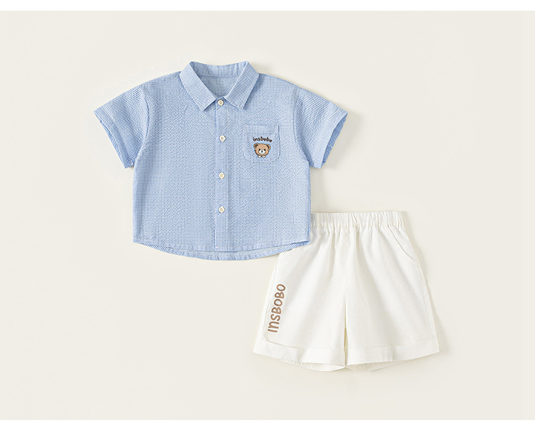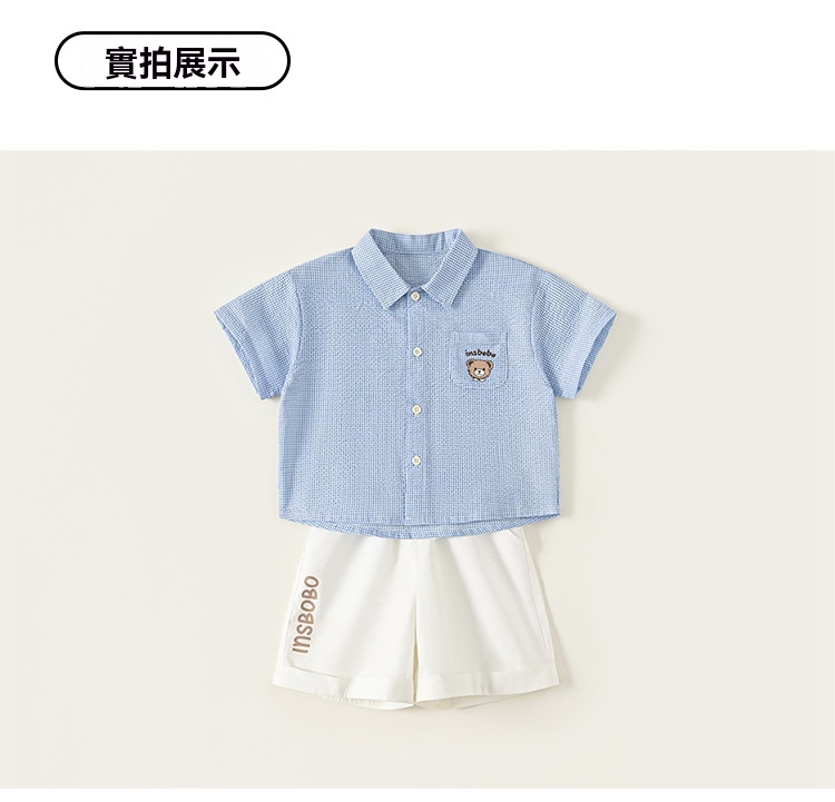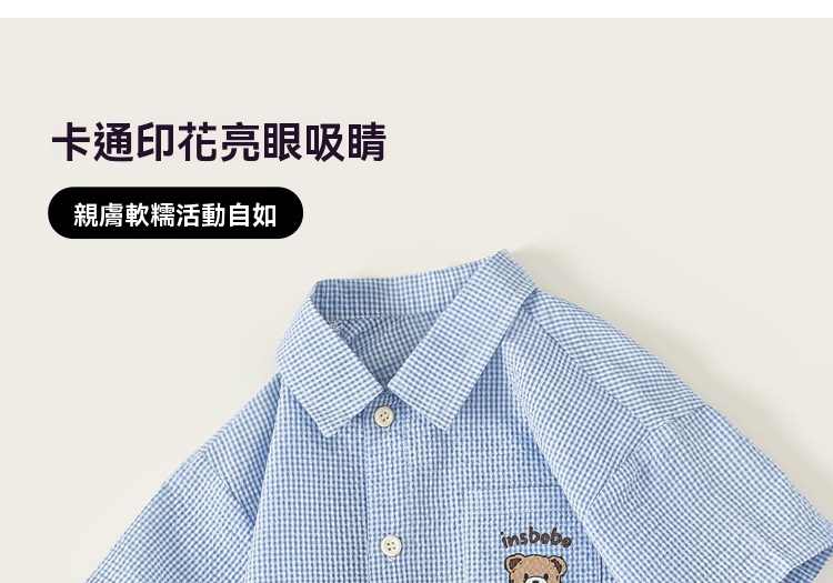 童裝夏款兒童小格子可愛印花襯衫純色印花短褲男小童兩件套