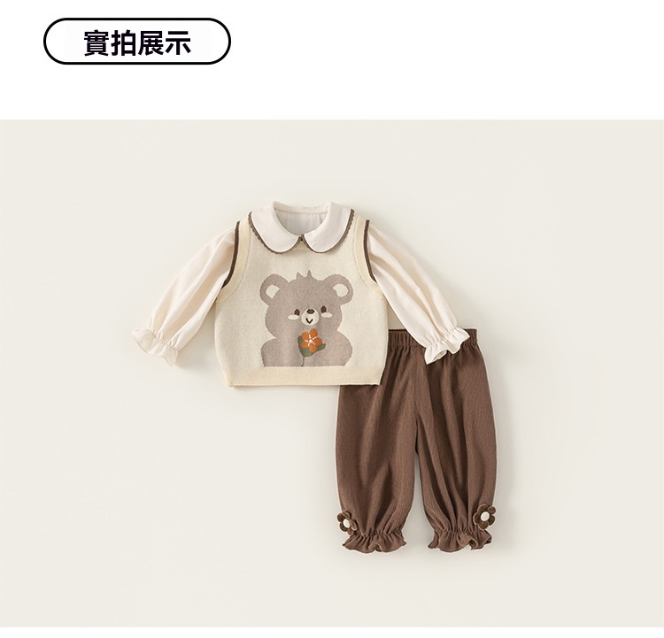童裝女童秋裝新款套裝洋氣小熊毛衣馬甲花邊領襯衣長褲三件套
