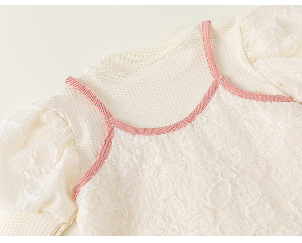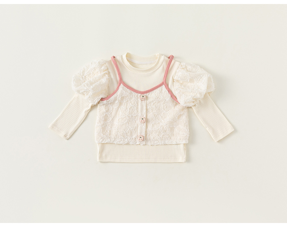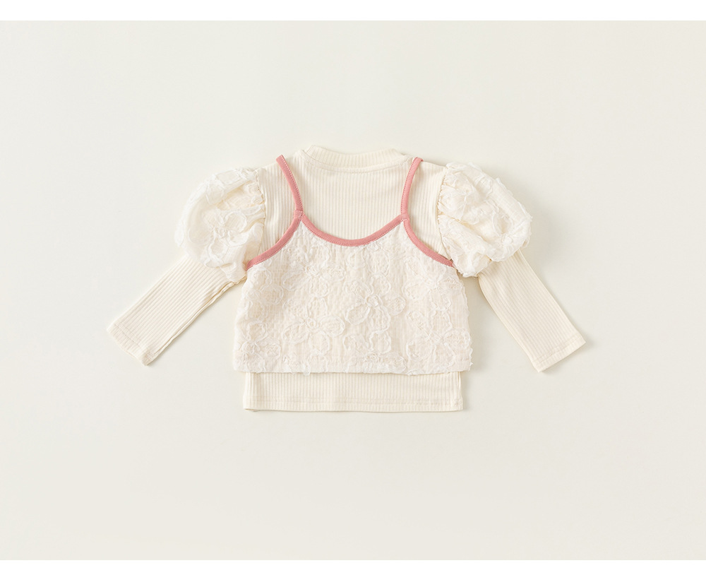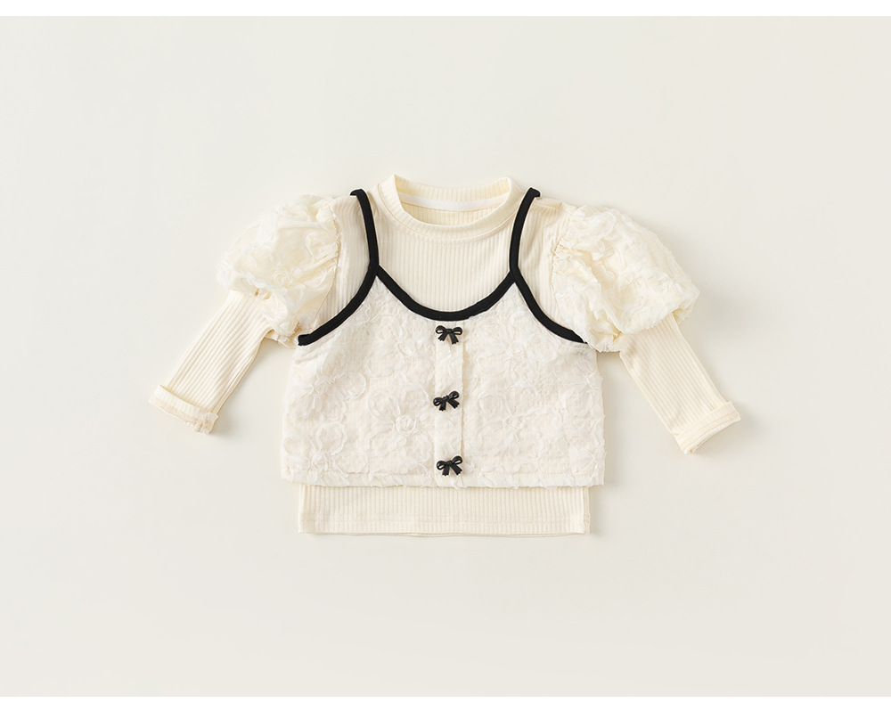 童裝新款女童上衣泡泡袖打底衫吊帶兩件套女孩子洋氣套裝秋裝