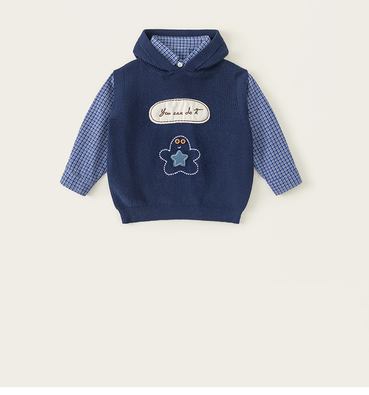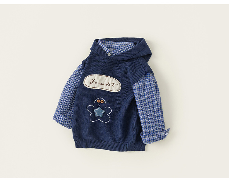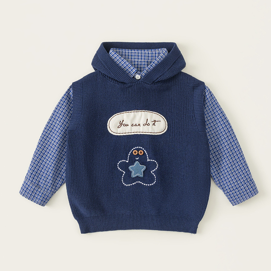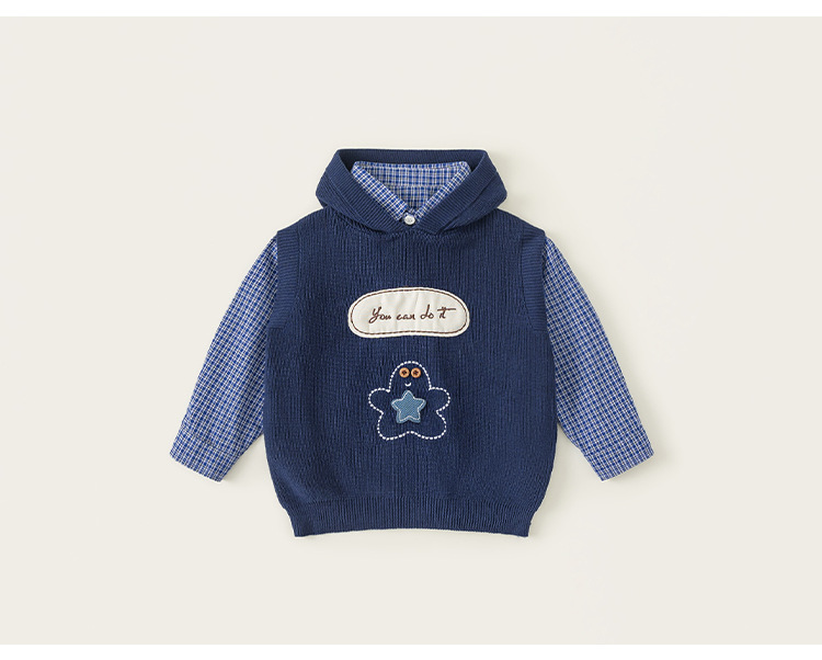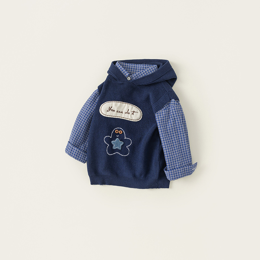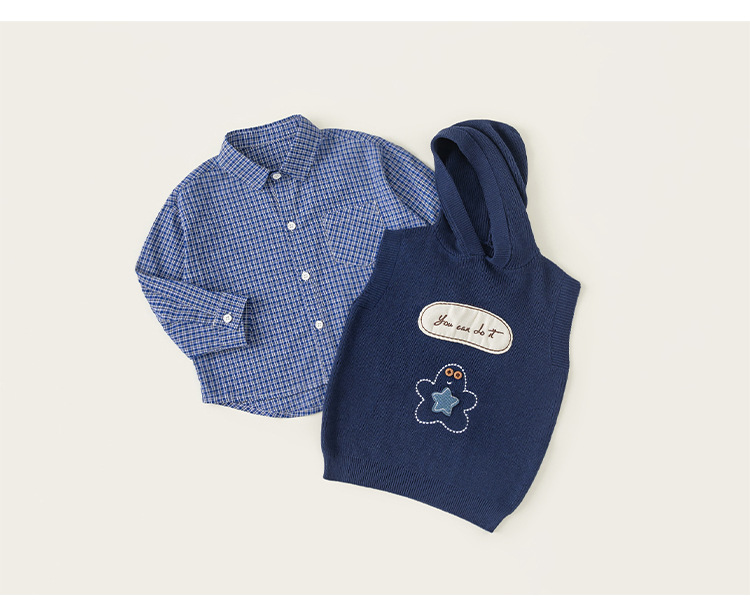 童裝男小童春季套裝帶帽字母刺繡毛衣馬甲休閒格子襯衫兩件套