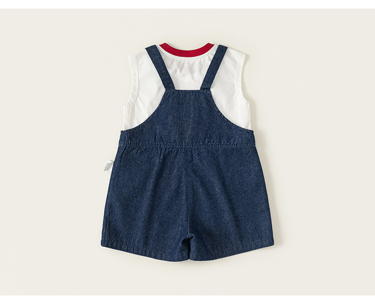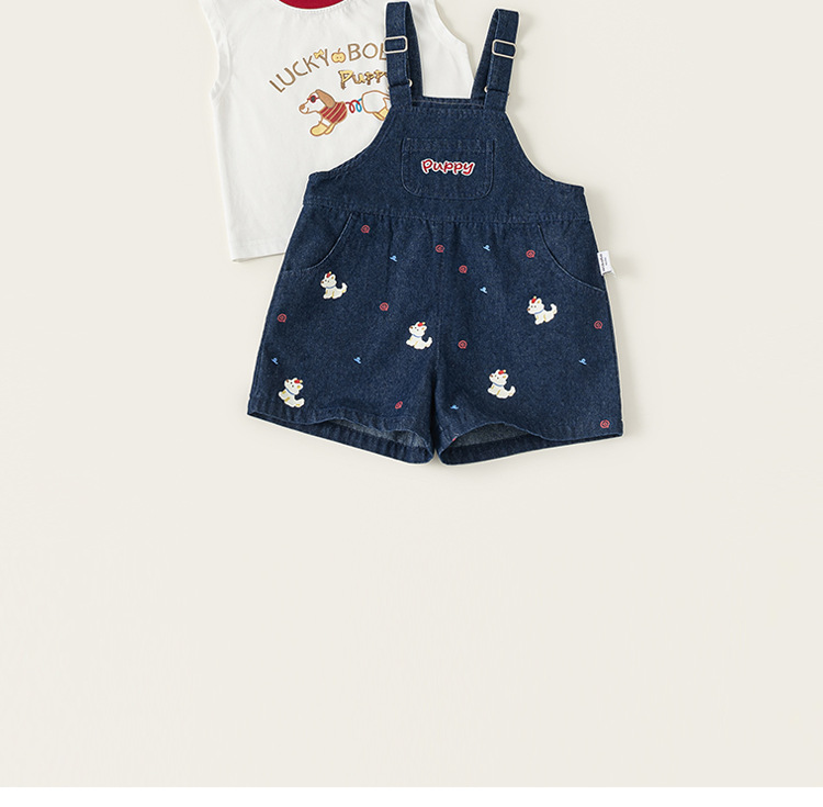 童裝男童套裝夏季新品撞色圓領背心小狗牛仔揹帶褲女童兩件套
